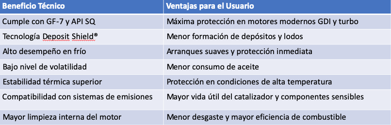 Este lubricante 100% sintético cumple con los nuevos estándares ILSAC GF-7 y API SQ, que van más allá de las normativas anteriores, al ofrecer una protección superior contra la pre-ignición a baja velocidad (LSPI), reducir la acumulación de depósitos en pistones y mejorar el desempeño en arranques en frío. Todo esto contribuye a una operación más suave, eficiente y confiable, particularmente en motores de inyección directa y turboalimentados.
