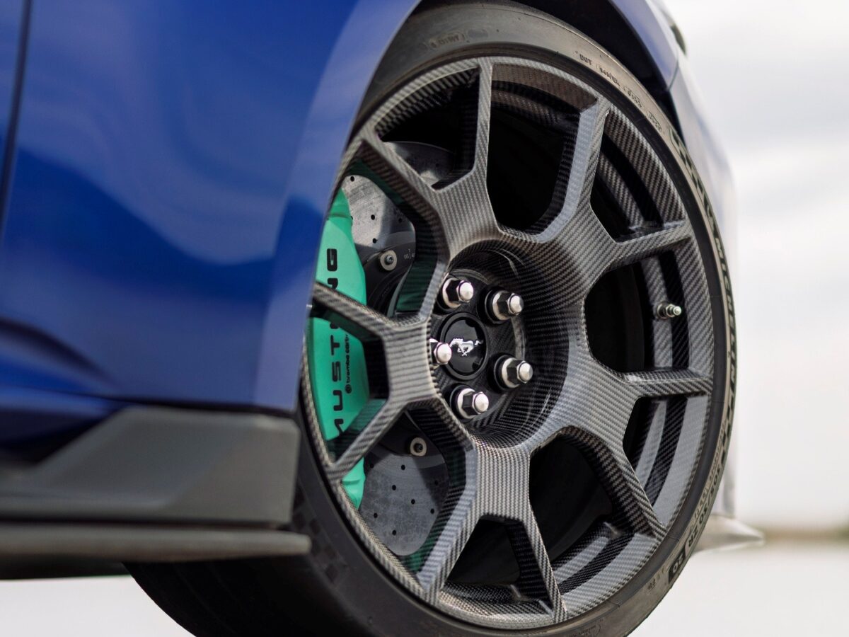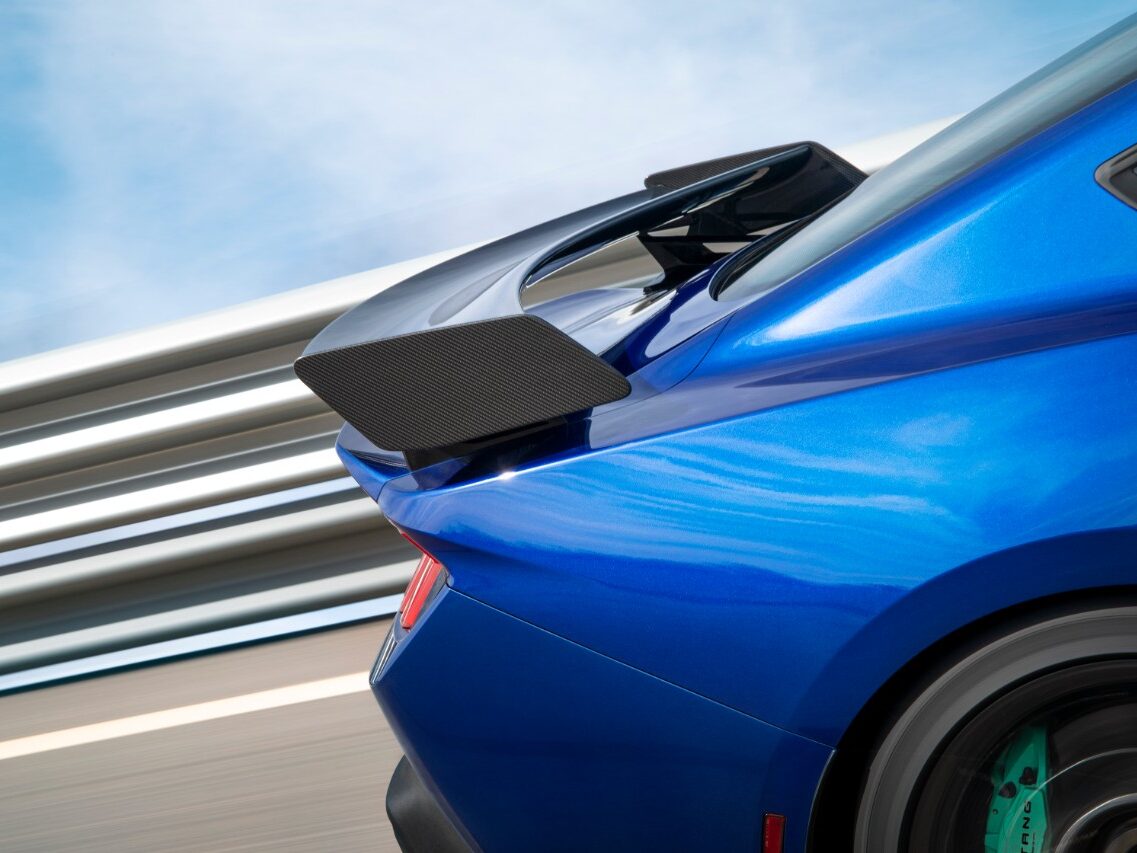 La aerodinámica y la refrigeración también fueron prioridades clave. Una nueva fascia delantera, un cofre de aluminio con ventilación de gran tamaño y un difusor trasero rediseñado optimizan el enfriamiento y generan mayor carga aerodinámica sin sacrificar la silueta icónica del Mustang. Con el Track Pack, el alerón trasero de fibra de carbono permite alcanzar hasta 280 kilogramos de carga aerodinámica a 290 km/h.