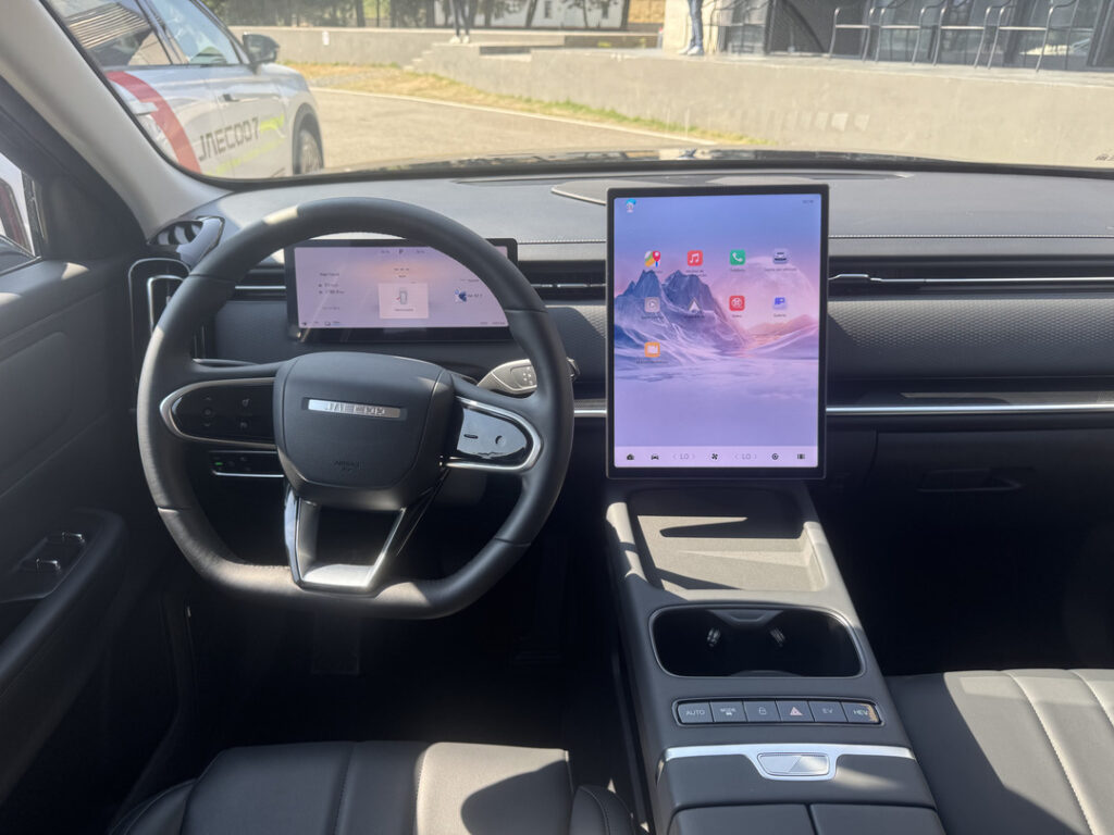 Pasando al interior, nos encontramos con un habitáculo bastante agradable. JAECOO 7 tiene una pantalla de infoentretenimiento de 14.8 pulgadas. La consola central es “flotante”, lo que permite tener espacios de almacenamiento de fácil acceso.