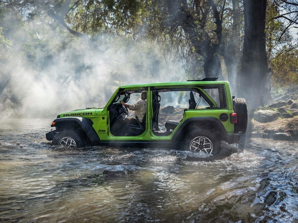 En cuanto a capacidades todoterreno, esta edición mantiene lo que ha hecho legendario al Wrangler: ejes Dana sólidos, caja de transferencia Rock-Trac, bloqueos Tru-Lok, rines de 17″ con neumáticos todoterreno de 33″, y una capacidad de vadeo de hasta 34 pulgadas. Su relación de arrastre de hasta 100:1 y el winch Warn de 8,000 lb refuerzan su liderazgo en el segmento 4×4.