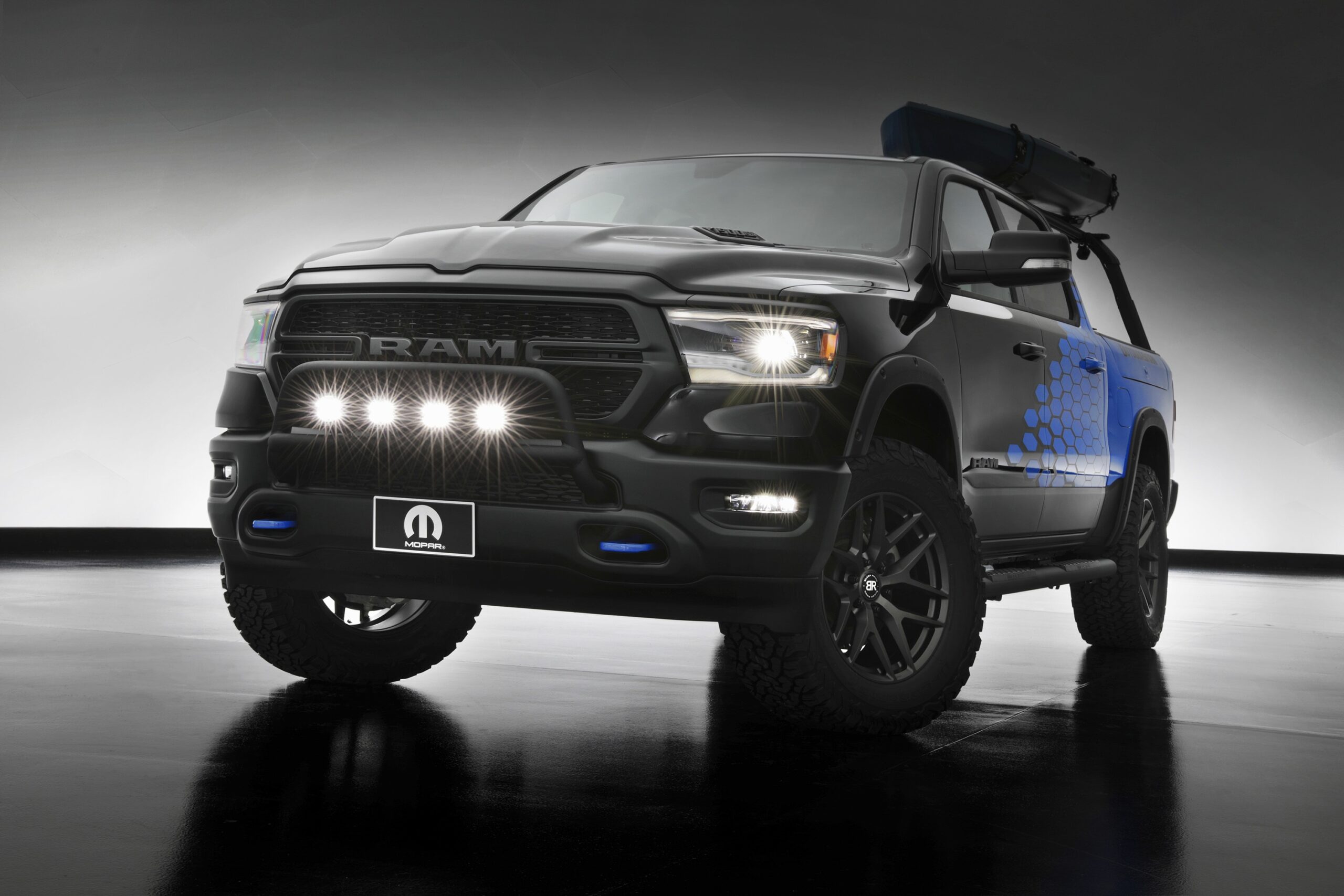 A partir de una Ram 1500 Big Horn Crew Cab 4×4 pintada en negro brillante con unos llamativos gráficos personalizados en Mopar Blue. Ram 1500 Outdoorsman Concept permite transportar todo el equipamiento necesario para el lugar de trabajo y, al mismo tiempo, puede transformarse con facilidad en la camioneta perfecta para disfrutar de cualquier actividad al aire libre.